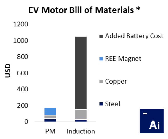 For example, the cost of increasing the capacity of a 60-kWh battery pack by just 5% to compensate for use of an induction traction motor can increase powertrain costs by upwards of US $300, which is almost double the entire bill of materials for the permanent magnet traction motor.