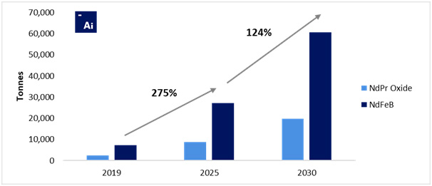 Adamas Intelligence forecasts that global annual passenger EV sales (excluding mild and micro hybrids) will increase from 4.6 million units last year to 14.0 million in 2025 and 34.5 million in 2030. With upwards of 80% of all EVs projected to use permanent magnet traction motors in the years ahead, the rapid rise in EV sales will fuel a 275% increase in demand for rare earths used in passenger EV traction motors between 2019 and 2025, and a further 124% increase in demand between 2025 and 2030.