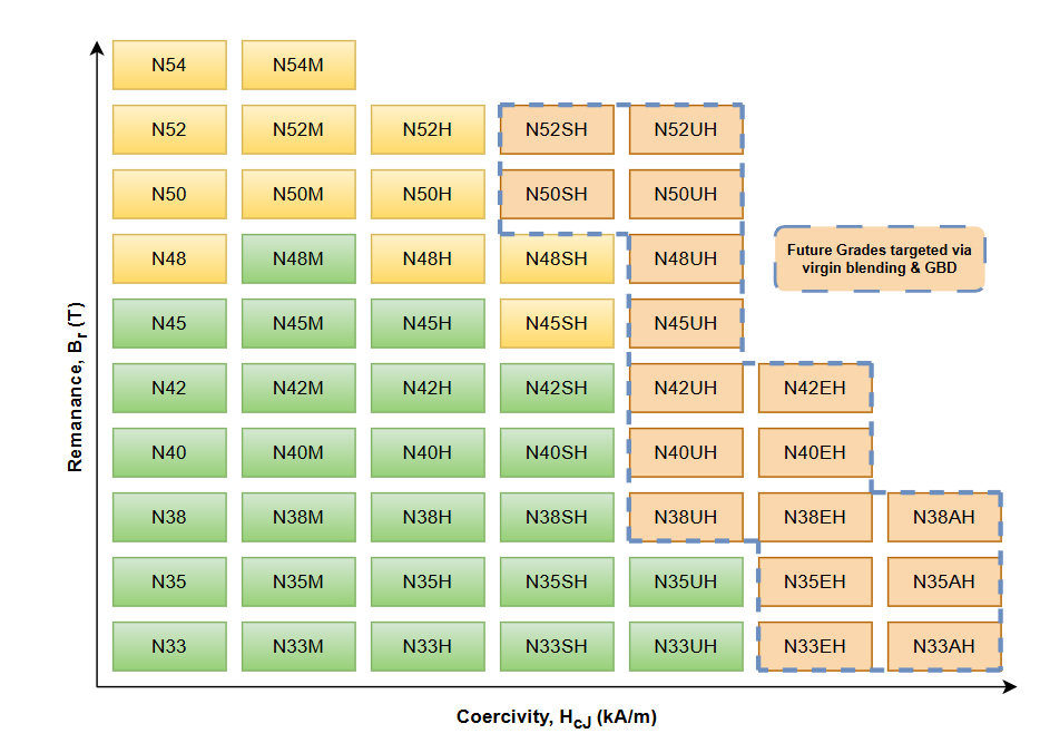 Above: NdFeB grades achieved (green) by HyProMag using recycled feedstock, expected grades achievable in the near-term (yellow), and future grades targeted with inclusion of GBD and virgin material blending (orange).
