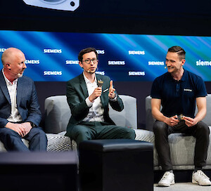 Left: Nick Mann, Managing Director of HyProMag (left) speaks at Hannover Messe 26 alongside Cedric Bardenhagen, Sustainability Manager, Motion Control, Siemens (centre) and Tobias Grimm, Sustainability Expert, Motion Control, Siemens (right) during the presentation of the SIMOTICS servomotor rotor produced by Siemens with HyProMag’s recycled magnets.