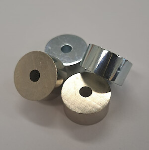 Right: Finished ring-shaped magnets in both blue zinc and Ni-Cu-Ni coatings