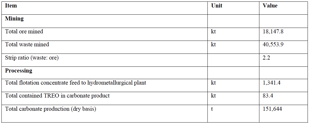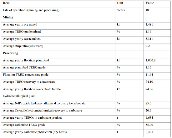 - Operating life of 18 years for Songwe, with production averaging 5,954 tonnes per year total rare earth oxides (“TREO”) for the first full five years of production, including 1,953 tonnes per year of neodymium and praseodymium oxides, and 56 tonnes per year of dysprosium and terbium oxides, in a MREC grading 55% TREO (dry basis).