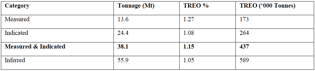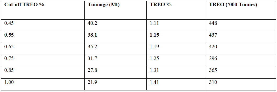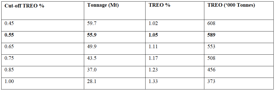 The Mineral Resources are reported from within an optimised pit shell and above a 0.55% TREO grade, as summarised below.