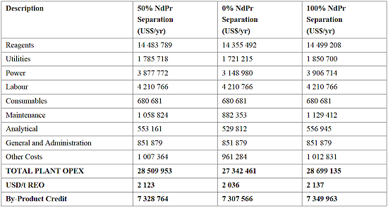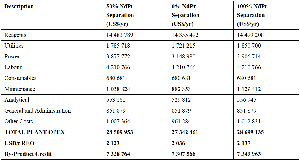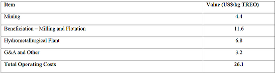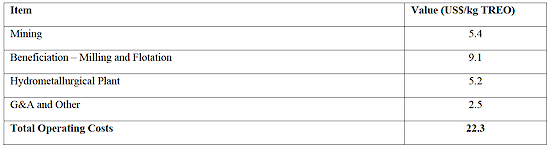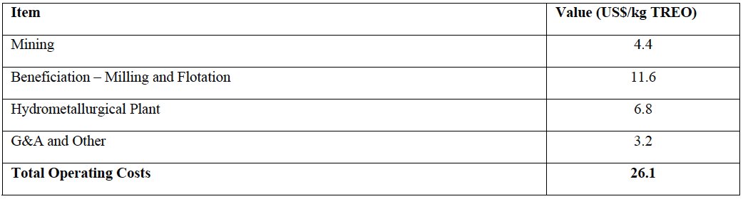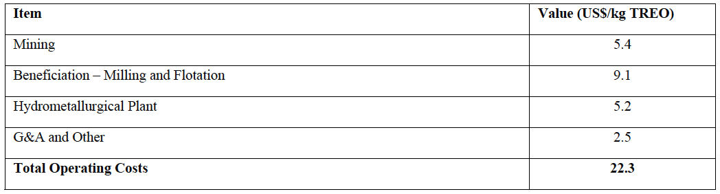 Cash operating costs include the costs of contract mining, milling, flotation, leaching, purification and precipitation to produce a MREC in addition to other costs associated with the operation. The operating costs do not include the cost of separation, which is reflected in the 15% discount applied to the basket value of the REOs in MREC. The estimate of operating expenditure (“OPEX”), and the associated general and administration (“G&A”) costs, were calculated to an accuracy of ±10% and were utilised in the economic analysis of the Project.