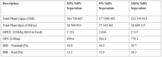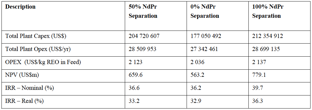 Financial metrics for the three NdPr separation options are summarised in the following table.