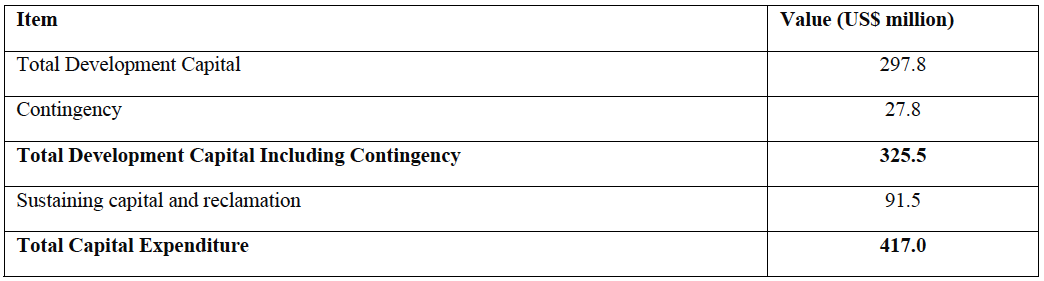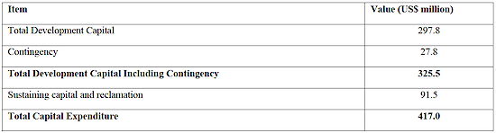 Based on the Study-level Assumptions in the DFS, total initial capital expenditure is US$297.8 million, not including a contingency of US$27.8 million.