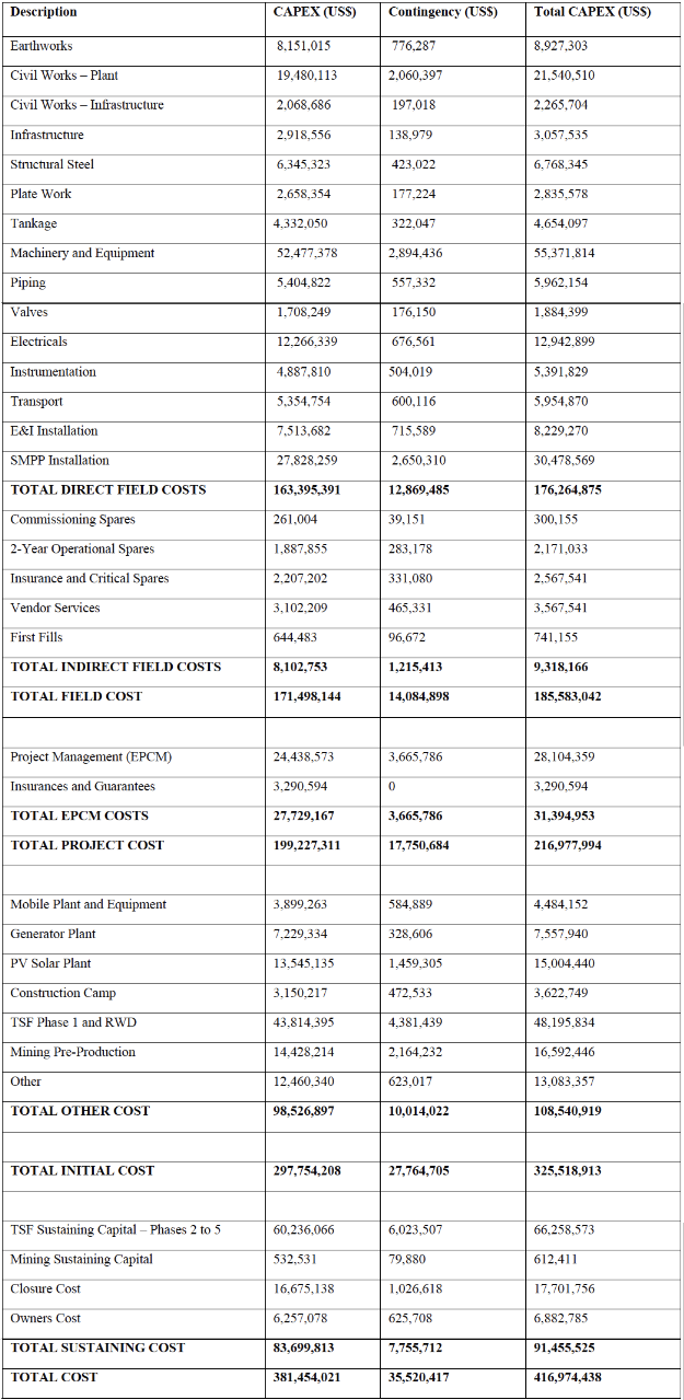 The estimate of initial capital expenditure costs was calculated to an accuracy of ±10% and was utilised in the economic analysis of the Project. The largest capex component is an integrated processing plant comprising a mill, flotation plant, hydrometallurgical plant, and a sulphuric acid plant with co-generated power capacity. The capex estimate for the integrated processing plant was completed by SENET and covers the design, engineering, procurement, supply/manufacture, construction and pre-commissioning of the proposed new processing facility and associated plant complex infrastructure including a 24.4 MW solar facility. Other major capex items include the cost of a lined tailings storage facility with design provided by Epoch.